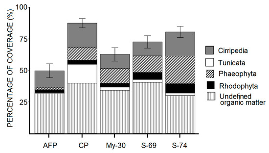 The color of the substratum is a factor that can affect the formation and settlement of biofouling communities; for that reason, in ecological experiments, it is important that the experimental and control plates have a similar color [86]. In our study, although the AF commercial paint was blue, the control (CP) and experimental plates were painted in the same color (white), and the results are comparative. The color on the surface (especially black and red) can affect the quantities of radiant energy absorbed or reflected, and this has an effect on the diversity and composition in the biofilm community and the subsequent settlement of marine invertebrates [87]. The surface roughness is another factor to consider, because it can reduce the bond strength of biofilms and reduce the settlement of algae spores [88,89]. In this study, it was not possible to determine the roughness of the plates after painting; further research is needed if we want to evaluate this.