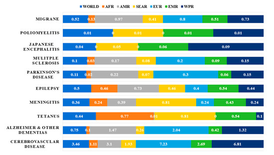 Neurological disorders as percentage of total DALYS by regions as defined by WHO in 2005 [3]. Abbreviations: DALYs: disability-adjusted life years; AFR: Africa Region; AMR: America Region; SEAR: South-East Asia Region; EUR: Europe Region; EMR: Eastern Mediterranean Region; WPR: Western Pacific Region.