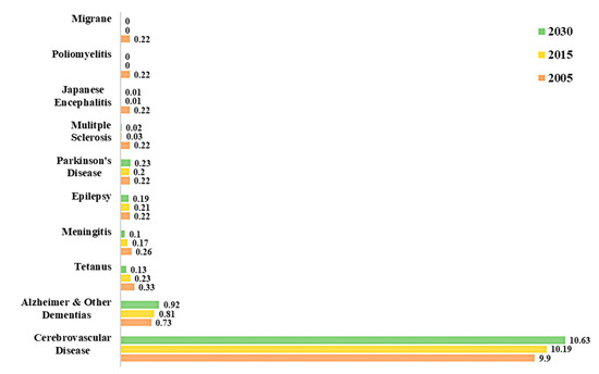 In fact, a study on global disease burden in 2016, has highlighted that neurological disorders were the leading cause of global disability-adjusted life-years (DALYs) affecting 276 million people [4]. Statistics from the World Health Organization (WHO) on the percentage of deaths attributed to neurological disorders in the years 2005 and 2015, and a projection for the year 2030 are shown in Figure 2 [3]. Out of all neurological disorders listed, cerebrovascular diseases (CVDs) accounted for about 10% of global deaths in 2015 and represents the neurological disorder with the overall highest mortality. Epilepsy, AD and other dementias, migraine, CVDs and tetanus are some of the neurological disorders that account for the highest percentage of total DALYs. Neurological disorders have been ranked as the second leading cause of deaths (9.0 million) in 2016 [4]