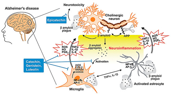 Neuroinflammation in AD. During the development of AD, Aβ peptide is produced by cleavage of APP, aggregates and accumulates as β amyloid plaques. Both aggregates and plaques cause neurotoxicity or activation of microglia through up-regulating NF-κB and AP-1 transcription factors, which in turn release ROS and pro-inflammatory cytokines such as NO, PGE2, IL-1, IL-6, and TNF-a that damage cholinergic neuron. These pro-inflammatory cytokines also directly activate astrocytes that also produce cytokines to amplify inflammatory signals and result in neuroinflammation and neurodegeneration. Flavonoids act through avoiding β amyloid induced-neuron injury and death, modulation of pro-inflammatory cytokines and ROS production, as well as inhibiting the activation of microglia and astrocyte as neuroprotective mechanisms. Abbreviations: AD: Alzheimer’s disease; APP: amyloid precursor protein; Aβ: amyloid beta; NF-κB: nuclear factor kappa B; AP-1: activator protein 1; ROS: reactive oxygen species; NO: nitric oxide; PGE2: prostaglandin E2; IL-1: interleukin-1; IL-6: interleukin-6; TNF-α: tumor necrosis factor alpha. Reproduced from [30], with permission from Royal Society of Chemistry, 2010.