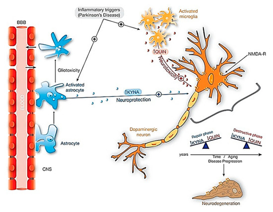Neuroprotective effects of KYNA against QUIN toxicity in dopaminergic neurons. When inflammatory triggers increased in Parkinsonism, both microglia and astrocytes activate significantly its activity. The activation of astrocytes producing KYNA is essential in this neuroprotection. Additionally, with aging and during disease progression there is an unbalance between KYNA and QUIN: in repair phases the amount of KYNA exceeds the amount of QUIN, and the contrary on the destructive phases and neurodegeneration. Abbreviations: KYNA: kynurenic acid; NMDA-R: NMDA Glutamatergic receptor; QUIN: Quinolinic acid. Reproduced from [58], with permission from Elsevier, 2017.