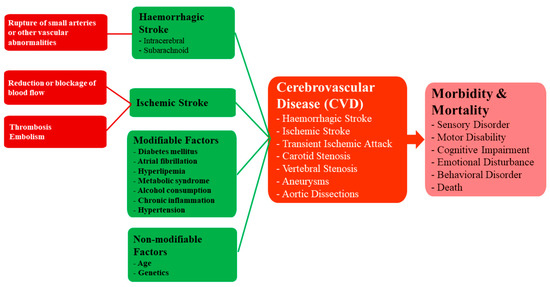 CVDs refer to a group of disorders affecting the vasculature of the brain. This group of diseases involve disorders in which a region of the brain is transiently or permanently affected by ischaemia or bleeding [64]. While there are numerous CVDs such as carotid stenosis, vertebral stenosis, aneurysms and aortic dissections, perhaps a condition of particular clinical interest is stroke, which is the second leading cause of death worldwide and a major cause of disability [65]. There are two broad categories of stroke, namely ischemic stroke involving cerebral vessel occlusions, which accounts for about 87% of all stroke cases in the United States (US), and haemorrhagic stroke involving intracerebral haemorrhage (ICH) accounting for the rest of the cases [66]. Regardless of the aetiology, stroke results in the acute onset of neurological deficits due to a focal CNS injury secondary to a vascular cause [67].