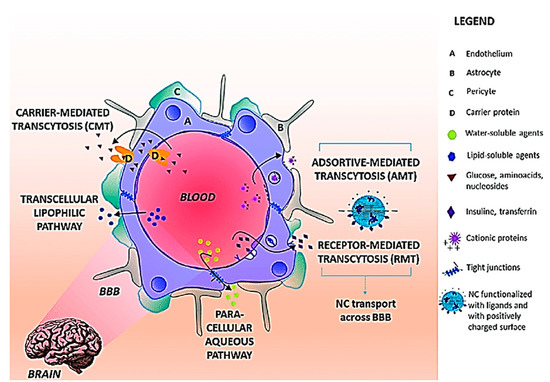 Transport pathways across BBB. The main routes for molecular traffic across the BBB are shown as well as the type of solutes that use each pathway. NC preferential pathways are (i) RMT when the NC surface is functionalized with ligands recognized BBB receptors and (iii) AMT when the NC surface is positively charged. Abbreviations: BBB: Blood Brain Barrier; NC: Nanocarriers; RMT: receptor mediated transcytosis; AMT: adsorptive-mediated transcytosis. Reproduced from [111], with permission from Elsevier, 2018.