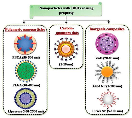 The advent of engineered tunable NPs, with sizes in the magnitude of a billionth of a meter, has opened doors to possible therapeutic applications and proposed as a novel approach, to solving the unaddressed problem of improving the transport of biologically active substances across the BBB [12,112]. NPs, being in the scale of 1 and 100 nm, possess peculiar physico-chemical properties with the capacity for modification [14]. NPs are therefore good candidates as drug carriers, due to their small size and consequently large surface area to volume ratio, which would allow the drugs carried to be closer to the surface of the NPs, leading to a faster rate of drug release and higher bioavailability [113]. Furthermore, taking advantage of various biological reactions, such as the receptor–ligand interaction and the antibody-antigen interaction, NPs are able to conjugate with biospecific molecules in a process called functionalization, which allow for targeted delivery of NPs in vivo [114]. The large surface area to volume ratio of NPs, permits multivalent functionalization which drastically increases the binding affinity of conjugated ligand to the desired target receptor [115]. NPs come in various forms and are divided into three primary groups: inorganic nanomaterials (metals, metal oxides, quantum dots and ceramic), organic nanomaterials (liposomes and polymer), and carbon-based nanomaterials [116]. The common types of NPs used in nanomedicine are summarized in Figure 8.