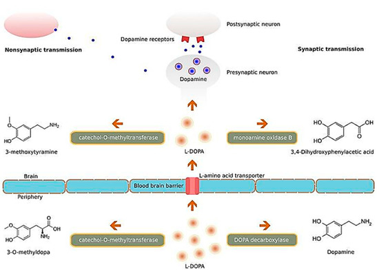 Illustration of the molecular mechanisms of L-DOPA. Abbreviation: L-DOPA: levodopa. Reproduced with permission from [159].