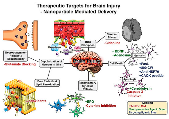 To date, much of the work on NPs in the treatment of TBI involves targeting various underlying pathophysiological pathways such as ischaemia, ROS, neuronal apoptosis, excitotoxicity and neuroinflammation, to discover potential therapeutic targets Figure 11 [178].