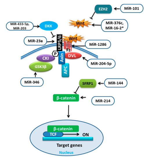 The increased differentiation of BMSCs into adipogenic cells can lower bone mass and increase the risk of bone fractures. Various miRNAs influence the commitment or favor one of the differentiations of BMSCs by influencing different pathways. The Wnt signaling pathway is a well-known signaling cascade that either depends on the β-catenin (Wnt/β-catenin pathway) or function independent of it (noncanonical pathways). The receptors such as low-density lipoprotein receptor-related protein (LRP) 5 and 6, and inhibitors like dickkopf-1 (DKK1), sclerostin, and secreted frizzled-related proteins (SFRPs) determine the fate of Wnt signaling by regulating β-catenin either for proteasomal degradation or for the nuclear translocation to regulate gene expression. This induces osteoblast differentiation through osterix [38,39]. The function of these receptors and inhibitors can be regulated by different miRNAs (Table 2) targeting different proteins involved in Wnt signaling (Figure 2).