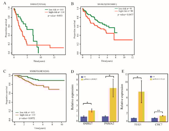 2.6. Validation of the SNHG7 Signature and lncRNA Perturbators Overexpression in LUAD