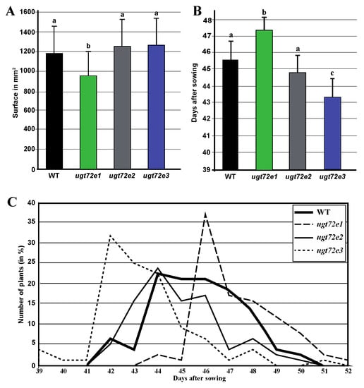 Effect of UGT72E gene mutation on the development of Arabidopsis thaliana. (A). Rosette surface sizes after 28 days of growth. (B). Average age of the plants when the flowering stem reached stage 5.1. (C): Distribution curve showing the ages of plants within the different genotypes at the flowering stem stage 5.1. Means (+ SD) with the same lowercase letters are not significantly different according to Anova completed with Tukey post-hoc test (p-value < 0.01; n > 70).