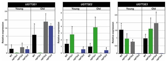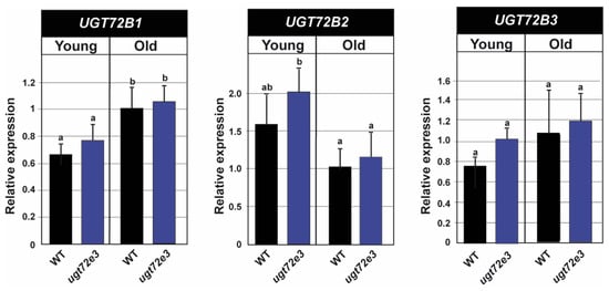 Expression analyses of UGT72B genes in WT and ugt72e3. RT-qPCR was used to measure the expression of the genes in the old and young parts of the stem. The values are expressed relative to the WT old stem fragments for each analyzed gene. PP2A (AT1G13320) and PEROXIN4 (AT5G25760) were used as internal reference genes. Means (± SD) with the same lowercase letters are not significantly different according to Duncan test (p-value < 0.05, n = 3).