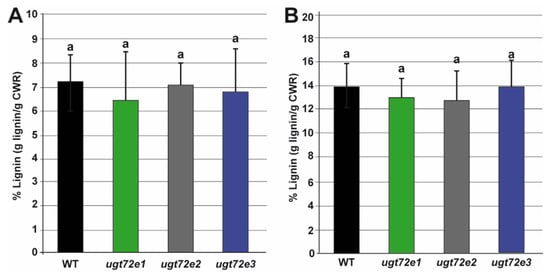 We first showed that the expression level of UGT72E3 was the same as in the WT (Figure S1). Concerning lignin dosage, our results revealed no significant differences in floral stem lignin content between WT and ugt72e1,2 samples when evaluated by either the acetyl bromide method (Figure S2) or the safranin O technique (Figure S3). Taken together, these data demonstrate that the observed modifications in cell wall lignin content are most likely caused by UGT72E3 gene knock-out.
