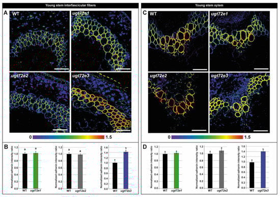 We firstly implemented a new quantification approach that we have developed based upon the potential of fluorescent microscopy coupled to safranin O staining [31]. Using this technique, it is now possible to generate high-definition spatial information about lignin localization as well as quantitative information based on ratiometric emission measurements. Our results showed that lignin deposition was significantly changed only in the ugt72e3 mutant, but not in ugt72e1 or ugt72e2. Lignin levels in both the xylem and interfascicular fibers from the younger part of ugt72e3 stems were higher when compared to the WT. In contrast, no statistical differences were observed in the bottom part of the organ that contains more mature cells.