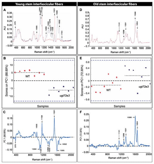Raman microspectroscopy and principal component analyses (PCA) of WT and ugt72e3 interfascicular fibers. The results are shown for the young (A–C) and old (D–F) parts of the floral stem. (A,D): Baseline corrected average spectra from 300 cm−1 to 2000 cm−1. The red spectrum corresponds to the WT and the blue to ugt72e3. Arrows indicate major peak Raman shift wavenumbers. (B,E): Principal component one (PC1) scores of individual WT (red) and ugt72e3 (blue) spectra following PCA. Each point represented corresponds to an independent individual. (C,F): Loading vectors for PC1 indicating peaks contributing to the corresponding PC1 scores.