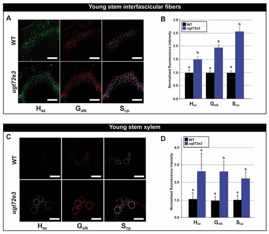 When compared to the WT samples, the interfascicular fiber cell walls from young stem regions of the ugt72e3 mutant incorporated significantly higher amounts of all three reporters (Figure 7A,B) suggesting that the lignification process was modified in this mutant. Examination of xylem from the same region also revealed changes in the lignification process (Figure 7C,D). Here, mutant cell walls incorporated significantly higher amounts of Galk- and Scp- reporters compared to WT samples. Only the incorporation of Haz was not significantly different between WT and mutant xylem cell walls.