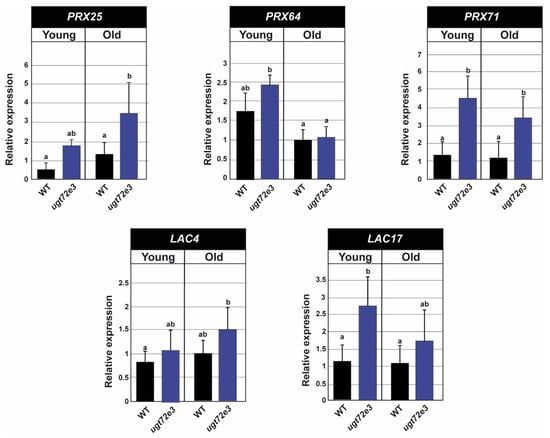 Expression analyses of selected laccases and peroxidases in WT and ugt72e3. PRX25, PRX64, PRX71, LAC4, and LAC17, genes were tested by RT-qPCR to measure the expression of the genes in the old and young parts of the stem. The values were relative to the WT old stem fragments for each analyzed gene. PP2A (AT1G13320) and PEROXIN4 (AT5G25760) were used as internal reference genes. Means (± SD) with the same lowercase letters are not significantly different according to Duncan test (p-value < 0.05, n = 3).