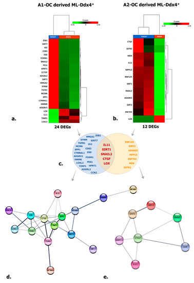 Targeted RNAseq of A2780 conditioned by ML-Ddx4+ cells. The image shows targeted RNAseq data depicting the expression of 118 genes enrolled in cancer cell processes in A2780 cells conditioned by ML-Ddx4+ cells from A1 (a) or A2 (b) NS-EOC. The heatmaps show both numbers and nomenclature of DEGs induced in A2780 by those cells (a,b), whereas the Venn diagram (c) depicts shared DEGs (−2 < FC < 2 (Fold Change); p ≤ 0.05 and False Discovery Rate (FDR) < 0.25) in A2780 OC cells differentially conditioned by ML-Ddx4+ cells from early-stage OC (A1) or advanced (A2) tumors. Functional gene networks of differentially expressed genes (DEGs) are represented as obtained by StringApp from Cytoscape (d,e). The results from this analysis support the hypothesis that, although at variable intensity, ML-Ddx4+cells from non-serous NS-EOCs are capable to deregulate a number of genes that are differentially enrolled in cancer biological processes.