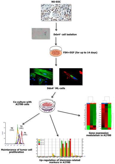 Summary of major experimental results. The present study investigated the role of Ddx4+ OSCs in post-menopausal women, focusing on the ovarian carcinogenesis and, in particular, on NS-EOC. Increased Ddx4 expression, evaluated by IHC, was demonstrated in samples from patients with advanced NS-EOC (A2), compared to those with early-stage disease (A1). Once the small round Ddx4+ cells were isolated from NS-EOC samples, we demonstrated that, in response to FSH + EGF stimulation, they differentiated to ML-cells, which exhibited spindle-like shape, stretched cytoskeleton and cytoplasmic Ddx4 localization. Co-culture of Ddx4+ ML-cells with A780 OC cells were thus performed, observing that the former maintained tumor cell proliferation, while inducing the acquisition of a “stem” and pro-metastatic phenotype by A2780 cells, as confirmed by transcriptomic analyses in targeted RNAseq.