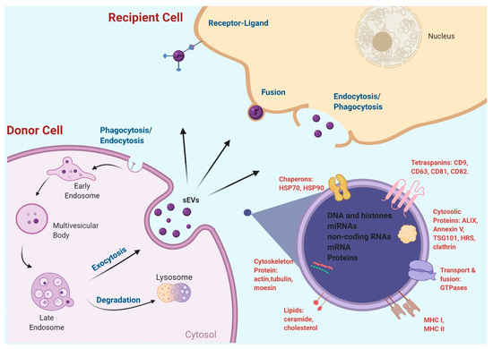 sEVs contain various RNA species. However, most studies demonstrated that small non-coding RNAs, such as microRNAs, are the major RNA species contained in sEVs, although the presence of mRNA, rRNA, and tRNA in sEVs was also reported [22,23]. Typically, sEVs may contain hundreds of microRNA species in various quantities that play important roles in intercellular communication [7,23,24,25]. Both coding and non-coding RNAs seem to be functional through transferring from host cells to the recipient cells [26,27,28]. Specific RNA profiles of sEVs derived from different biofluids or tissues are categorized by several databases, including: Exobase [29], exRNA Atlas [30], and miRandola [31].