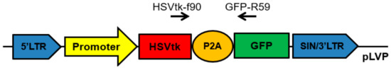 For in vitro studies, we prepared lentiviral constructs containing the suicide gene HSVtk and reporter gene GFP linked together by the DNA-sequence of P2A peptide, which allows researchers to obtain products of both genes in a ratio of approximately 1:1 (Figure 1) [30]. The constructs differed only in promoters.