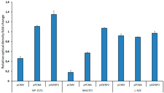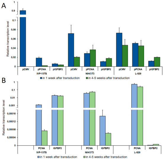During cell cultivation, transcription of the transgene from the pPCNA and the pIGFBP2 promoters in the NIH/3T3 and the L-929 fibroblasts was the most stable, while the relative number of transcripts from the pPCNA promoter was three to five times higher than from the pIGFBP2 promoter. Immediately after transduction, the relative transcription level of the transgene from the pCMV promoter was the highest among all promoters in all cell lines. Relative transcription level did not differ in NIH/3T3 and L-929 fibroblasts and was an order of magnitude higher in the primary culture IVP-15TS. However, during long-term cultivation of cells, the decrease in transcription from pCMV was the highest possible, a complete inhibition in IVP-15TS, an order of magnitude decrease for NIH/3T3, and a two-fold decrease for L-929 fibroblasts.