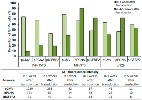 In all transduced cells IVP-15TS, the proportion of GFP+ cells decreased with prolonged cultivation regardless of the type of promoter used, but the greatest decrease was under pCMV. In cell lines NIH/3T3 and L-929, a decrease in the number of GFP+ cells was observed only under pCMV. The GFP fluorescence intensity was higher under pCMV than that under pPCNA or pIGFBP2.