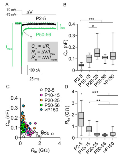 Development of intrinsic membrane properties in M1 layer V (M1LV) pyramidal neurons. (A) Representative current elicited by a −5 mV hyperpolarizing voltage step applied at −70 mV. Black and green traces show typical amplitudes of maximal current (Imax) and of steady-state membrane leak current (Imem) for P2–5 (black) and P50–56 (green) neurons. Cell capacitance (Cm) was calculated as ratio between time-constant (τ) and series resistance (Rs = 5 mV/Imax). RIn was calculated as the ratio between step voltage (−5 mV) and Imem. (B) Cm significantly increased with age. (C) Cm and RIn were inversely related. (D) RIn significantly decreased with age. * p < 0.05; ** p < 0.01; *** p < 0.001; P2–5: n = 24; P10–15: n = 21; P20–25: n = 21; P50–56: n = 19; P > 150: n = 20 (more details in Table S1, Supplementary Materials).