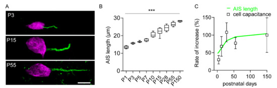 2.1. Increase in Cell Size and AIS Elongation Are Synchronized in the First Postnatal Weeks