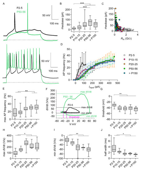 Development of intrinsic excitability and action potential firing in M1LV pyramidal neurons. (A) Upper panel: action potential (AP) elicited by rheobase currents (500 ms) from resting membrane potential in P2–5 neurons (black) and P50–56 neurons (green). Lower panel: maximal AP firing frequency at P2–5 (black) and P50–56 (green). (B) Rheobase significantly increased with age. (C) Relationship between rheobase and RIn fitted by Ohm’s law (I = V/R), with V (16 mV, color code shown in G). (D) Input–output curve showing AP frequency elicited by current steps of 500 ms and of increasing amplitude (IInput). (E) Maximal AP firing frequency according to the age groups. (F) Phase plots of AP slope (dV/dt) against voltage (V) show P2–5 (black) to P50–56 (green) AP kinetics. Pink lines and dotted line indicate AP threshold (dV/dt > 20 V/s). Dashed lines highlight maximal and minimal slopes (max dV/dt and min dV/dt). (G). AP threshold significantly decreased with age. (H–I) Peaks of the first derivative of voltage over time (dV/dt): max dV/dt (H), min dV/dt (I). (J) AP half-width. * p < 0.05; ** p < 0.01; *** p < 0.001; P2–5: n = 24; P10–15: n = 21; P20–25: n = 21; P50–56: n = 19; P > 150: n = 20 (more details in Table S4, Supplementary Materials).
