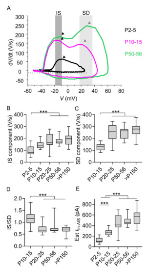 Development of AIS (IS) and somatodendritic (SD) components. (A) Phase plots show slope of AP (dV/dt) at P2–5 (black), P10–15 (pink), and P50–55 (green). Shaded areas and arrowheads highlight the maximum-slope peaks of phase 1 (dark gray) and phase 2 (light gray). (B,C) IS component (B) and SD component (C). (D) Ratio between IS and SD components. (E) Estimated inward currents at the AIS (Est Iin-AIS), according to IS amplitude and AIS capacitance (I = C × dV/dt). *** p < 0.001 P2–5: n = 24; P10–15: n = 21; P20–25: n = 21; P50–56: n = 19; P > 150: n = 20 (more details in Table S5, Supplementary Materials).