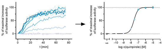 The ability to perform measurements in living cells allows one to retrieve kinetic information about protein–protein interactions [40,46]. Additionally, the utilized ELuc results in improved sensitivity of the test system, as the signal brightness is increased compared to commercially available test kits [45]. Moreover, this homogeneous assay can be conducted very rapidly without the necessity for any washing or separation step, facilitating the development of high-throughput screening campaigns [45]. To investigate the responses of the D2-like receptors upon agonist stimulation, a β-arrestin recruitment assay, based on the split luciferase complementation technique, was established in this study and is described as follows.