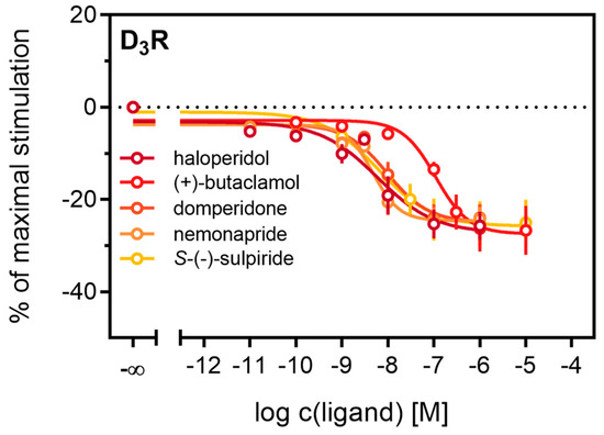 Antagonistic activities (pKb) of (+)-butaclamol, domperidone, haloperidol and nemonapride at the D2longR (Figure 4B) also correlated very well with data described in the literature (Table 3), with the minor exception of S-(−)-sulpiride. The same generally applies to the D3R (Figure 4B), with nemonapride and (+)-butaclamol showing slight differences (Table 3). A constitutive interaction of the D3R with β-arrestin has been repeatedly reported [37,54], which we also observed in our assay, as all antagonists were capable of lowering the arrestin-dependent luminescence signal at the D3R below the baseline. Therefore, the set of antagonists was also tested for inverse agonism in the developed assay (agonist mode) as shown in Figure 5. All these ligands exhibited negative efficacy at the D3R and potencies, which were comparable with the respective pKb values (Table 3).