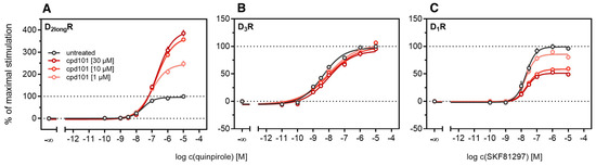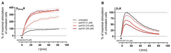 The kinetic profiles of β-arrestin2 recruitment to the D2longR and the D1R under the influence of cpd101 are shown in Figure 8. In both cases, the time courses of the GPCR/β-arrestin interaction with and without cpd101 were similar; only the efficacy was influenced in opposite directions. It is noteworthy that the kinetic course of β-arrestin2 recruitment to both receptors differs markedly. For the D1R, it has been described that β-arrestin2 is recruited rapidly, whereas the complex of receptor and arrestin is relatively unstable and already dissociates at the plasma membrane [28]. These findings are reflected by the course of our kinetic measurement, where we observed a steep increase in luminescence signal followed by a rapid decline after reaching a maximum (Figure 8B). This contrasts with the kinetic behavior at the D2longR, where the luminescent signal appears to stabilize (Figure 8A), suggesting that there is a more stable interaction between the D2longR and β-arrestin2.