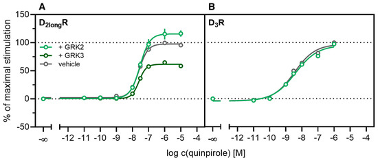 According to a generally accepted paradigm, G-protein coupled receptor kinases (GRKs) directly link the attenuation of G-protein signaling to arrestin recruitment and therefore play an important role in the desensitization and internalization processes of GPCRs [21]. However, a large body of this knowledge was gained from studies with the β2-adrenergic receptor [21] and it has been shown that there are significant differences among GPCRs. In the case of the D2-like receptors, it was shown that especially GRK2 and 3 play an important role in these processes [67]. The exact mechanism is not fully understood yet. Therefore we decided to investigate the influence of these kinases in the developed method. Firstly, effects of the selective GRK2/3 inhibitor compound 101 (cpd101) [68] were investigated. The cells co-expressing the ELucN-βarr2 and the D2longR-ELucC or D3R-ELucC were pre-incubated with the inhibitor at increasing concentrations and concentration-response curves of quinpirole were generated, as displayed in Figure 6. Surprisingly, the inhibition of GRK2/3 in the cells expressing the D2longR led to an increase in the luminescence signal to almost 400% (p < 0.05) (Figure 6A) and the potency was decreased by almost one log unit (p < 0.05). Regarding the D3R, the use of cpd101 had no significant effect on the efficacy (p = 0.21) or potency (p = 0.19) of quinpirole (Figure 6B). Since, for the D1R, phosphorylation by GRK2 precedes the association of the D1R with β-arrestin2 [69], we constructed an analogous β-arrestin2 recruitment assay for the D1R (cf. Methods) as a control. The D1R-ELucC construct was validated by radioligand saturation binding and β-arrestin2 recruitment experiments and the results are presented in the Supplementary Materials (Figures S2 and S3, Tables S1 and S2). All data were in agreement with data from wild-type receptors. Subsequently, the influence of the inhibition of GRK2/3 by using cpd101 was investigated. As expected, inhibition of the kinases led to a concentration-dependent decrease in maximal response induced by the D1R standard agonist SKF81297 (cf. Figure 6C) by about 47% (p < 0.05) and the potency was only affected to a minor extent (p = 0.87). To further unravel the effects of the GRKs, the impact of exogenous overexpression of GRK2 and/or GRK3 on β-arrestin2 recruitment to the D2longR and D3R was investigated. The HEK293T cells expressing ELucN-βarr2 and D2longR-ELucC or D3R-ELucC were transiently transfected with a plasmid encoding GRK2 or GRK3. Their response to stimulation with quinpirole was compared to the response of cells that were mock transfected with the empty vector. As illustrated in Figure 7A, GRK2 overexpression in the D2longR-ELucC expressing cells led to a slight increase in luminescence signal, although this was not statistically significant (p = 0.17). Interestingly, the overexpression of GRK3 led to a marked decrease in luminescence signal (p < 0.05) to about 59% of the maximum signal exhibited by the mock transfected cells. This led to the assumption that the increase of the luminescence signal in the experiments with cpd101 (Figure 6) is mainly caused by the inhibition of GRK3. The β-arrestin2 recruitment to the D3R (Figure 7B) was not affected (p = 0.21) by exogenous GRK2 overexpression, suggesting that endogenous levels of the GRKs are sufficient to ensure β-arrestin2 recruitment or that GRKs are only marginally involved in this process. Additionally, the potency of quinpirole at either receptor was not altered (p > 0.05).