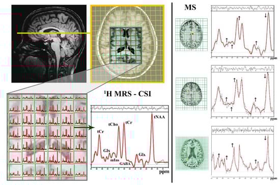 Visualization of proton-1 magnetic resonance spectroscopy (1H MRS). 1H MRS examination of brain tissue by using the multivoxel spectroscopy (1H magnetic resonance spectroscopic imaging (MRSI)–chemical shift imaging (CSI)) approach with the representing spectra (one CSI voxel indicated with the green arrow) containing metabolite peaks for total creatine (tCr), total choline (tCho), total N-acetyl-aspartate (tNAA), glutamate and glutamine (Glx), γ-aminobutyric acid (GABA), and myoInositol (mIns). The 1H MRS spectra for the healthy (on the left) and MS-affected (on the right) brain are also depicted together with the highlight of the typical metabolic peaks changes via small black arrows (↓: decreased, ↑: increased).
