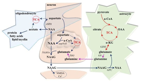 Despite NAA being one of the most concentrated (10–20 mM [,]) molecules in the CNS and despite its having been studied for more than five decades, its neurochemical functions, especially under pathological conditions, remain unclear [,]. As previously determined (Figure 2), NAA synthesis (via aspartate N-acetyltransferase) occurs exclusively in neuronal mitochondria, whereas NAA breakdown (via aspartoacylase) is a membrane-associated process localized predominantly in the oligodendrocytes [,,]. Among its many biochemical features, NAA, is particularly important for the maintenance of neuro-glial signaling [,,]. NAA has been proposed to be an intermediate metabolite in the formation of the not fully elucidated neurotransmitter NAAG [,,], although NAAG reaches maximally 10% of the NAA concentration [,]. Therefore, NAA is thought to have a more crucial function as a reservoir for glutamate [,], which is the most abundant neurotransmitter in the human brain [,]. In particular, in times of dynamic glutamate replenishment, NAA can be converted to glutamate via dipeptide NAAG transformation (by carboxypeptidase expressed on the extracellular surface of astrocytes) [,] and an energetically favorable set of tricarboxylic acid (TCA cycle) reactions (α-ketoglutarate in neuronal mitochondria) [,]. Paradoxically, both NAA and NAAG are defined as (low affinity) agonists and antagonists at the main glutamate receptors, suggesting a primary role of NAA in avoiding myelin loss induced by glutamate overloading [,]. Moreover, NAA probably plays essential roles in neuronal osmoregulation, the secondary nitrogen removal system, mitochondrial bioenergetics maintenance, TCA cycle intermediate replacement, and lipid and protein synthesis including myelin formation in oligodendrocytes [,]. Given that NAA is considered to occur almost exclusively within neurons, axons, and dendrites [,], its peak in 1H MRS of the brain (Figure 1) is assumed to be a crucial biomarker of neuronal density and viability, a determinant of neuro-axonal functionality, and possibly an essential sign of irreversible disease progression [,].