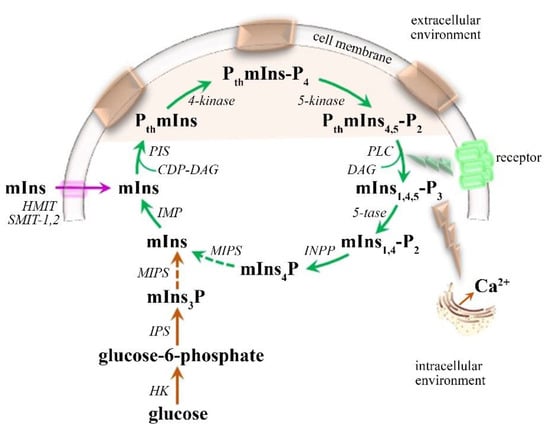 Schematic representation of myoInositol (mIns) metabolism. mIns can be incorporated into cytidine diphosphate diacylglycerol (CDP-DAG) via the activity of phosphatidylinositol synthase (PIS) generating phosphatidylmyoInositol (PthmIns). Further phosphorylation of PthmIns by phosphatidylinositol 4-kinase (4-kinase) forms phosphatidylmyoInositol 4-phosphate (PthmInsP4) and subsequently, via phosphatidylinositol 4-phosphate 5-kinase (5-kinase), produces phosphatidyl 4,5-bisphosphate (PthmIns4,5-P2). PthmIns, PthmInsP4 and PthmIns4,5-P2 are incorporated constituents of cell membranes (depicted as blocks in the cell membrane and colorfully highlighted in the intracellular environment). In response to agonists, activated receptors stimulate phospholipase C (PLC), which hydrolyzes PthmIns4,5-P2 to form DAG and myoInositol 1,4,5-trisphosphate (mIns1,4,5-P3). mIns1,4,5-P3 is a soluble molecule capable of binding to membrane receptors on the endoplasmic reticulum causing Ca2+ release into the cytoplasm. mIns1,4,5-P3 may also be dephosphorylated by inositolpolyphosphate 5-phosphatase (5-tase) forming myoInositol 1,4-bisphosphate (mIns1,4-P2) and further by inositol polyphosphate 1-phosphatase (INPP) generating myoInositol 4-monophosphate (mIns4P). The activity of several myoInositol phosphate synthases (MIPS) leads to the production of myoInositol 1-monophosphate (mInsP). The dephosphorylation of mInsP to mIns is catalyzed by inositol monophosphatase (IMP). However, mIns can be reuptaken from the extracellular space via three specialized mIns transporters (Na+-dependent myoInositol cotransporters-1 and 2 (SMIT-1,2); H+-dependent myoInositol cotransporter (HMIT)) or synthesized from glucose via hexokinase (HK) and myoInositol-3-phosphate-synthase (IPS) to myoInositol-3-phosphate (mIns3P) and further catalyzed by MIPS and IMP.
