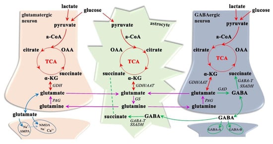 Despite glutamate not crossing the blood–brain barrier [,,], it shows appreciable concentrations throughout the CNS (5–10 mM []), suggesting that it has metabolic importance. Although it can be found in all brain cells, its highest levels are reached in the synaptic vesicles of nerve terminals, from where it can be released into the synaptic cleft [,]. Glutamate is physiologically taken back up into neurons and astrocytes but can be synthesized (Figure 4) from glucose or pyruvate (through the TCA cycle and α-ketoglutarate, which receives an amino group by the activity of aminotransferase in astrocytes) or from glutamine (by phosphate-activated glutaminase in neurons), in addition to being formed from α-ketoglutarate (by glutamate dehydrogenase in astrocytes or neurons) [,,]. Given that the glutamate pool is maintained in equilibrium, it is predominantly accumulated in neuronal synaptic vesicles (based on vesicular glutamate transporters-1, 2, and 3) but can also be reconverted back to α-ketoglutarate and metabolized through the TCA cycle in both astroglia and neurons and transformed to GABA (by glutamate decarboxylase in GABAergic neurons) or glutamine (by glutamine synthetase in astrocytes) [,,]. In particular, the glutamate-glutamine cycle between neurons and astroglia is highly active, representing approximately 85% of the glutamate turnover rate []. This neuroglial transmitter recycling is an essential transporting system to ensure not only the astrocytic release of glutamine (Na+-dependent neutral amino acid transporters-3 and 5) and its neural uptake (Na+-dependent neutral amino acid transporters-1,2, and 7; slc38-family; alanine-serine-cysteine transporter-2) [,], but also the neuronal leakage of glutamate (vesicular exocytosis; anion channels; reversed glutamate transport proteins, glutamate/cystine exchanger) and its ingestion into astrocytes (glutamate transporter-1; glutamate aspartate transporter; excitatory amino acid transporters-1 and 2) and neurons (Excitatory amino acid transporter-3, ionotropic and metabotropic glutamate receptors) [,,].