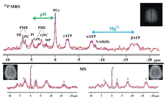 Visualization of phosphorus-31 magnetic resonance spectroscopy (31H MRS). 31P MRS brain tissue examination represents the measured signal from the voxel depicted on MRI in green square. The following metabolite peaks are shown: phosphoethanolamine (PE), phosphocholine (PC), phosphomonoesters (PME), inorganic phosphate (Pi), glycerophosphoethanolamine (GPE), glycerophosphocholine (GPC), phosphodiesters (PDE), membrane phospholipids (MP), phosphocreatine (PCr), nicotinamide adenine dinucleotide (NAD(H)), and adenosine triphosphates (α-, β-, γ-ATP). Graphical representations of the indirect pH (chemical shift of Pi and PCr depicted as green arrow) and [Mg2+] evaluation (chemical shift of α-ATP and β-ATP depicted as blue arrow) are also indicated in the fitted MR spectra. The 31P MRS spectra for a healthy (at the top) and MS-affected (at the bottom) brain are also depicted together with the highlight of the typical metabolic peaks changes via small black arrows (↓: decreased, ↑: increased).