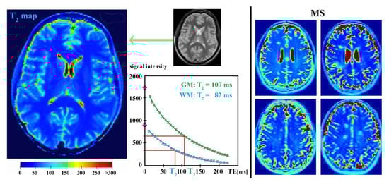 T2-weighted MRIs are often used as a supporting clinical tool for the diagnosis of various brain pathologies, including MS [,,,]. The distinguishing of brain tissue alterations on these scans is based on the different T2 relaxation times (Figure 6) that reflect the exchange of energy between spins on a molecular scale [,]. The widely used T2 relaxometry method is the multiple spin echo sequence (usually the Carr–Purcell–Meiboom–Gill sequence) exploiting the phase coherence of nuclear spins after a 90° radiofrequency pulse followed by a series of 180° refocusing pulses [,]. This arrangement is gradually lost because of the spin–spin interactions and magnetic field inhomogeneities, which manifest as the gradual decay of the transverse magnetization [,,]. For T2 relaxation measurement, single/multi-slice images that are repeatedly collected at several echo times are usually suitable, enabling the exponential loss of the signal to be fitted at each image pixel [,,]. Thus, T2 is the time required for the transverse magnetization to fall to approximately 37% of its initial value [,].