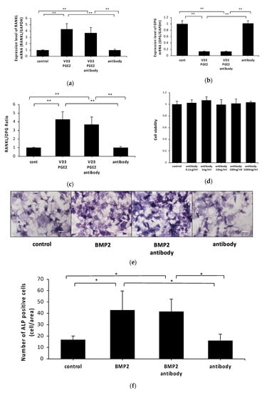 2.2. Anti-c-fms Antibodies Do Not Affect RANKL and OPG mRNA Levels or Osteoblast Viability or Differentiation