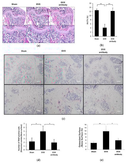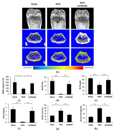 2.3. Anti-c-fms Antibodies Inhibit Bone Resorption and Bone Loss in OVX Mice