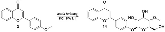 - Dymarska, M.; Janeczko, T.; Kostrzewa-Susłow, E. Glycosylation of Methoxylated Flavonoids in the Cultures of Isaria fumosorosea KCH J2. Molecules 2018, 23, 2578. [Google Scholar] [CrossRef]
