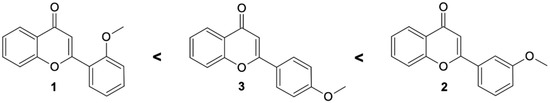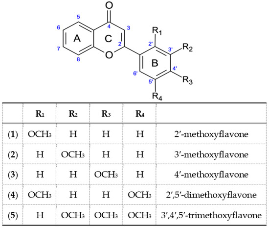 Flavonoids are common in the world of plants as their secondary metabolites, mainly in citrus fruits, olive oil, seeds [1] and vegetables [2]. They function as pigments in coloration of plants [3,4], root growth regulators, and plant defense reaction agents, and are involved in the transport of auxins between plant cells [5]. Flavonoids are present in our diet and have desired pro-health activities, including antioxidant, anti-inflammatory, anti-cancer [3,6,7], antibacterial, antifungal and antiviral activities [6,8]. Some methoxyflavones (e.g., 3′-methoxyflavone) have the ability to prevent parthanatos [9]. It is estimated that we consume a maximum of about 1 g of flavonoids a day, depending on the type and amount of meals consumed [10].