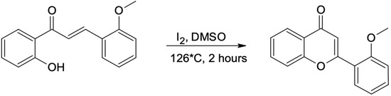 After 2 h of reflux, the product of the Claisen-Schmidt reaction was transferred into an acid environment and filtered using a Buchner funnel. The obtained product (appropriate methoxychalcone) was confirmed by NMR analysis. All other methoxychalcones were synthesized analogously. Methoxyflavones were synthesized from methoxychalcones by reaction with iodine in DMSO with 2–3 h incubation (until the substrate has reacted completely) at 130 °C [40], as presented in the example below (Scheme 3 and Scheme 4).