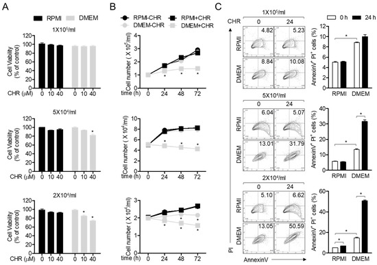 Chrysophanol (Figure 1), a member of the anthraquinone family, has been shown to possess anti-cancer activity, since it regulates proliferation and brings about apoptosis of cancerous cells [10]. In particular, chrysophanol has been reported to cause cytotoxicity and pro-apoptotic activities in Jurkat T cells cultured in DMEM (Dulbecco’s Modified Eagle Medium) medium [14]. By contrast, several studies have reported that chrysophanol does not exhibit cytotoxic effects and protect cells from critical damages [15,16,17]. To clarify whether treatment with chrysophanol exhibits cytotoxicity on Jurkat T cells cultured using different conditions as previously reported, we performed an MTT (3-(4,5-dimethylthiazol-2-yl)-2,5-diphenyl tetrazolium bromide) assay by comparing different media (RPMI (Rosewell Park Memorial Institute) versus DMEM) and different densities of cells (2 × 104/mL to 1 × 105/mL). Figure 2A revealed that 40 μM chrysophanol did not exert cytotoxic effects on Jurkat T cells cultured in RPMI and DMEM at a density of 1 × 105/mL but displayed mild cytotoxicity to Jurkat T cells cultured only in DMEM at a density of 5 × 104/mL or 2 × 104/mL. To obtain growth rate of Jurkat T cells in the presence of 40 μM chrysophanol, we counted the number of Jurkat T cells cultured in these two media every 24 h. As shown in Figure 2B, Jurkat T cells cultured in DMEM showed a significant decrease in growth rate compared to Jurkat T cells cultured in RPMI. To confirm whether the population of apoptotic cells induced by treatment with chrysophanol is dependent on culture media and cell number, AnnexinV/PI (Propidium Iodide) apoptosis assay was performed. Jurkat T cells cultured in DMEM exhibited an increased apoptotic population compared to Jurkat T cells cultured in RPMI, however, treatment with chrysophanol has no pro-apoptotic at the density of 1 × 105/mL. These results suggest that chrysophanol does not cause cell death and apoptosis in Jurkat T cells cultured in RPMI medium.