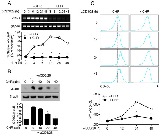 Chrysophanol suppresses the expression of CD40L in activated T cells. (A) Jurkat T cells were pre-treated with 40 μM of chrysophanol for 1 h and stimulated by anti-CD3/CD28 antibodies for 3 to 48 h. mRNA levels of cd40l were determined by conservative (top) and quantitative (bottom) PCR. (B) Jurkat T cells were pre-treated with the indicated concentrations of chrysophanol for 1 h and stimulated by anti-CD3/CD28 antibodies for 24 h. The expressed CD40Ls were detected by Western blot analysis, normalized to β-actin, and presented in a bar graph. (C) Jurkat T cells were pre-treated with 40 μM of chrysophanol for 1 h and stimulated by anti-CD3/CD28 antibodies for 12 to 48 h. The expressions of CD40L on cell surface were acquired by flow cytometry. Mean fluorescence intensities were presented in line graph. The mean value of three experiments ± SEM is presented. * p < 0.05 between cells stimulated by anti-CD3/CD28 and cells indicated. CHR—chrysophanol, MFI—Mean fluorescence intensity.