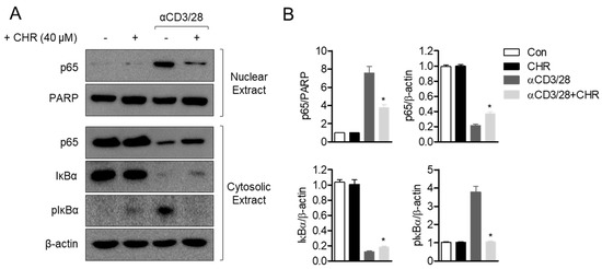 Treatment with chrysophanol blocks NFκB signaling pathway in activated T cells. (A) Jurkat T cells were pre-treated with 40 μM of chrysophanol for 1 h and stimulated by anti-CD3/CD28 antibodies for 1 h. Translocated p65, IκBα and phosphorylated IκBα were analyzed by Western blot from nuclear and cytosolic extracts. (B) Detected bands were normalized to PARP (poly (ADP-ribose) polymerase) for p65 in nuclear extract and β–actin for p65 in cytosolic extract, IκBα and phosphorylated IκBα. Normalization was shown in bar graph. The mean value of three experiments ± SEM is presented. * p < 0.05 between cells stimulated by anti-CD3/CD28 and cells indicated. CHR—chrysophanol, Con—control.