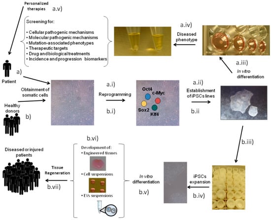 Schematic representation of induced pluripotent stem cells (iPSCs) as a tool for (a) disease modeling and (b) regenerative medicine. For disease modeling purposes, somatic cells are obtained from a patient and reprogrammed (a.i) to establish the iPSC line (a.ii). In vitro differentiation (a.iii) is necessary to obtain the diseased phenotype (a.iv) that allows for the set-up of disease models and drug discovery platforms (a.v). For regenerative medicine approaches, somatic cells can be obtained from healthy donors and reprogrammed (b.i) to establish iPSC lines (b.ii), which are deposited in a bank (b.iii). iPSCs from banks only need to be expanded (b.iv) and differentiated in vitro (b.v) to develop the biological treatment (b.vi) that can later be used for tissue regeneration (b.vii) in a group of diseased or injured patients.