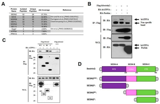 FLAG-Sesn2WT (SESN2ABC), FLAG-Sesn2∆BC(SESN2A), FLAG-Sesn2∆A(SESN2BC), and FLAG-Sesn2∆AB (SESN2C) were subcloned into pcDNA3.1 plasmid (Invitrogen, Carlsbad, CA, USA) []. HA-ULK1 WT, HA-ULK1 KI (kinase-inhibited), HA-Parkin, and GFP-LC3 were from Dr. K.L. Guan (UC-San Diego, San-Diego, CA, USA), Dr. M. Aghajan (Ionis Pharm. Inc., Carlsbad, CA, USA), and Addgene []. Myc-ULK1 WT and Myc-ULK1 KD (kinase dead) were a generous gift from Dr. D. H. Kim (University of Minnesota, Minneapolis, MN, USA). HA-hSestrin2 and FLAG-hSestrin2 were a generous gift from Dr. J. H. Lee (University of Michigan, Ann Arbor, MI, USA). FLAG-hSestrin2 S73A and S254A mutants were produced using a Phusion Site-Directed Mutagenesis Kit (F541) and confirmed by DNA-sequencing using primers from Eurofins Genomics (Lousville, KY, USA). pCMV3-HA-hATP5A (HG14419-NY) and pCMV3-FLAG-mATP5A (MG59917-CF) were purchased from Sino Biological (Wayne, PA, USA). Antibodies to detect ULK1 (4773), p-ULK1 S555 (5869), p62/SQSTM1 (5114), p-p62/SQSTM1 S403 (39786), and LC3 (3868) were from Cell Signaling Technology. Anti-Sestrin2 (10795-1-AP) antibody was from Proteintech (Rosemont, IL, USA). Anti-ATP5A was from Abcam (Cambridge, MA, USA). Anti-hemagglutinin (HA) antibody (3F10) was from Roche (Basel, Switzerland). Anti-Actin, Anti-GAPDH, and anti-Tubulin antibodies were from Developmental Studies Hybridoma Bank (Iowa City, IA, USA). Anti-FLAG (M2) antibody was from Sigma (Sigma-Aldrich, St. Louis, MO, USA). Mitotracker Red was purchased from Invitrogen. TTM (ammonium tetrathiomolybdate, (NH4)2MoS4, 323446), BHA (B1253), and NAC (A7250) were purchased from Sigma. CuSO4 (C1297), CuCl2 (451665), H2O2 (H1009), and CCCP (C2759) were purchased from Sigma.