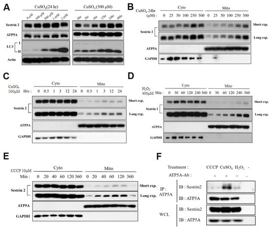 In previous studies, most mitochondria-signaling proteins, such as Nix, Bnip3, Fundc1, Cardiolipin, and FKBP8, were reported to associate with the outer mitochondrial membrane (OMM) upon carbonyl cyanide m-chlorophenyl hydrazone (CCCP) or H2O2 treatment, triggering the association with autophagosomes [,,]. On the other hand, in the case of Prohibitin2-mediated mitophagy, this inner mitochondrial membrane (IMM)-resident protein can directly associate with LC3 in autophagosome []. In C. elegans, Cu-induced ROS robustly induced cSesn [] that is subsequently regulating mitochondrial functions via direct association with mitochondria []. Therefore, we tested whether Sestrin2 is associating with mitochondria upon various mitochondria-damaging stresses, including Cu-induced heavy metal stress [], oxidative stress H2O2 [], and mild uncoupling with CCCP []. We observed that ROS generated by excessive Cu induced Sestrin2 and, subsequently, autophagy in both concentration- and time-dependent manner (Figure 2A). Among various mitochondrial stress conditions, Cu up to 500 µM sequestered Sestrin2 by associating with mitochondria for up to 24 h (Figure 2B,C). H2O2 treatment up to 400 µM caused oxidative stress and sequestered Sestrin2 by associating with mitochondria for up to 6 h (Figure 2D), but we could not measure longer time points due to cytotoxicity. CCCP treatment up to 10 µM triggered more acute mitochondrial association of Sestrin2 up to 6 h (Figure 2E) than CuSO4 treatment. These data raise the possibility that Sestrin2 may be mediating mitophagy induction by dynamically associating with mitochondria via binding to mitochondria adaptor proteins (Figure 1A)—distinctively under different levels of mitochondrial stress conditions. Next, we assessed the Sestrin2-ATP5A association under the conditions of CCCP, CuSO4, and H2O2 stress. Remarkably, we observed the strongest association between Sestrin2 and ATP5A in the CuSO4-treated group (Figure 2F).